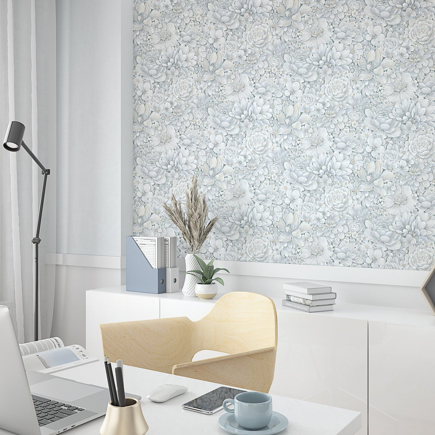 A stylish floral wallpaper with a wealth of detail. Three dimensional flowers erupt in a layered feast of large peonies , apple blossoms, orchids and roses. Whether your home is traditional or modern, this wallpaper in various shades of blue and grey will complement your space to perfection. The beauty of this vinyl wallpaper is not only will it add texture to your walls, but it will also cover slight imperfections, giving your room the finish you want. So whether you are looking for a floral wallpaper for a living room, bedroom or dining room, this paper could be your perfect choice.