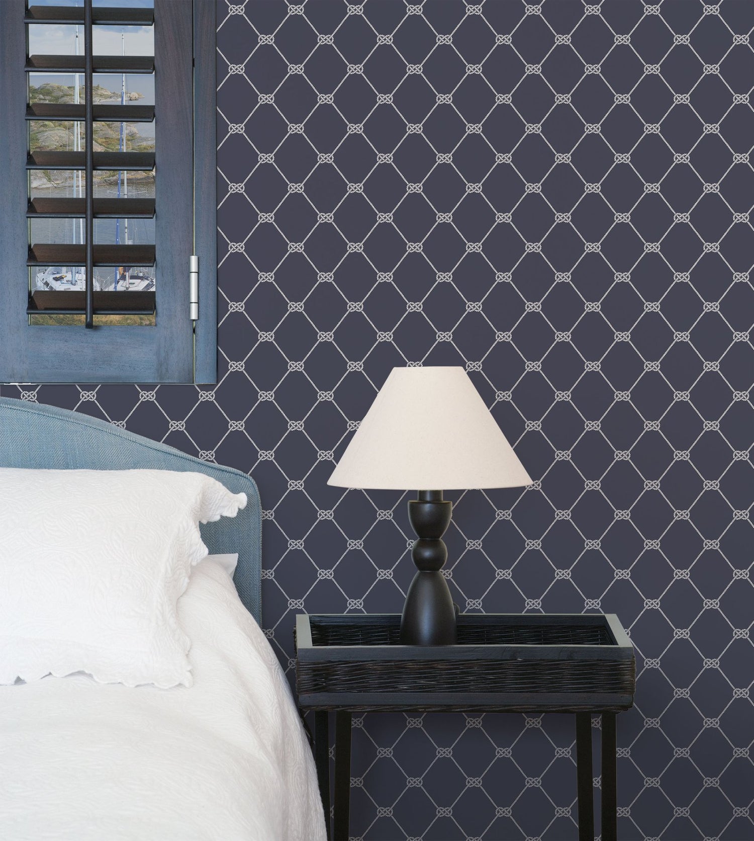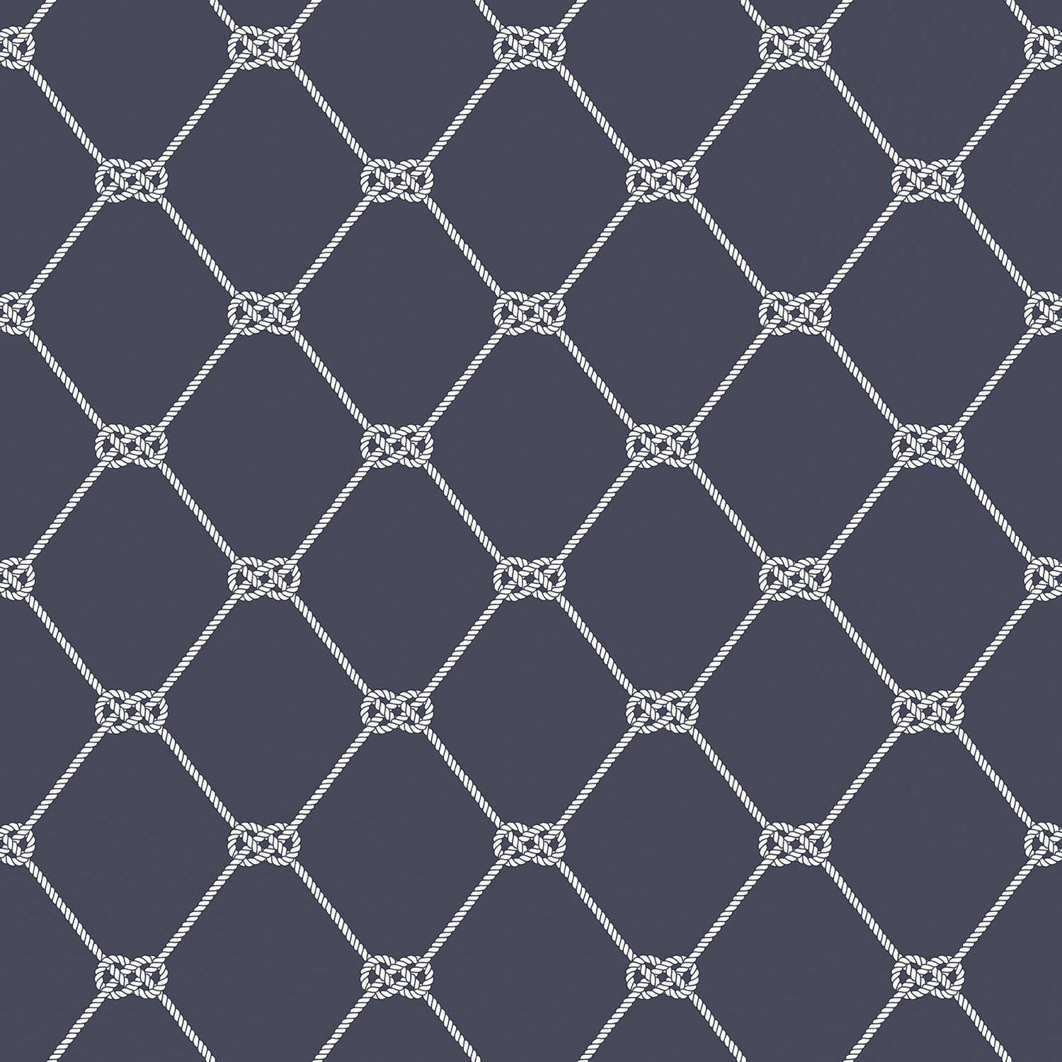 Nautical themed wallpaper from the collection, featuring a geometric design of sailing knots in a navy blue and white colourway.
