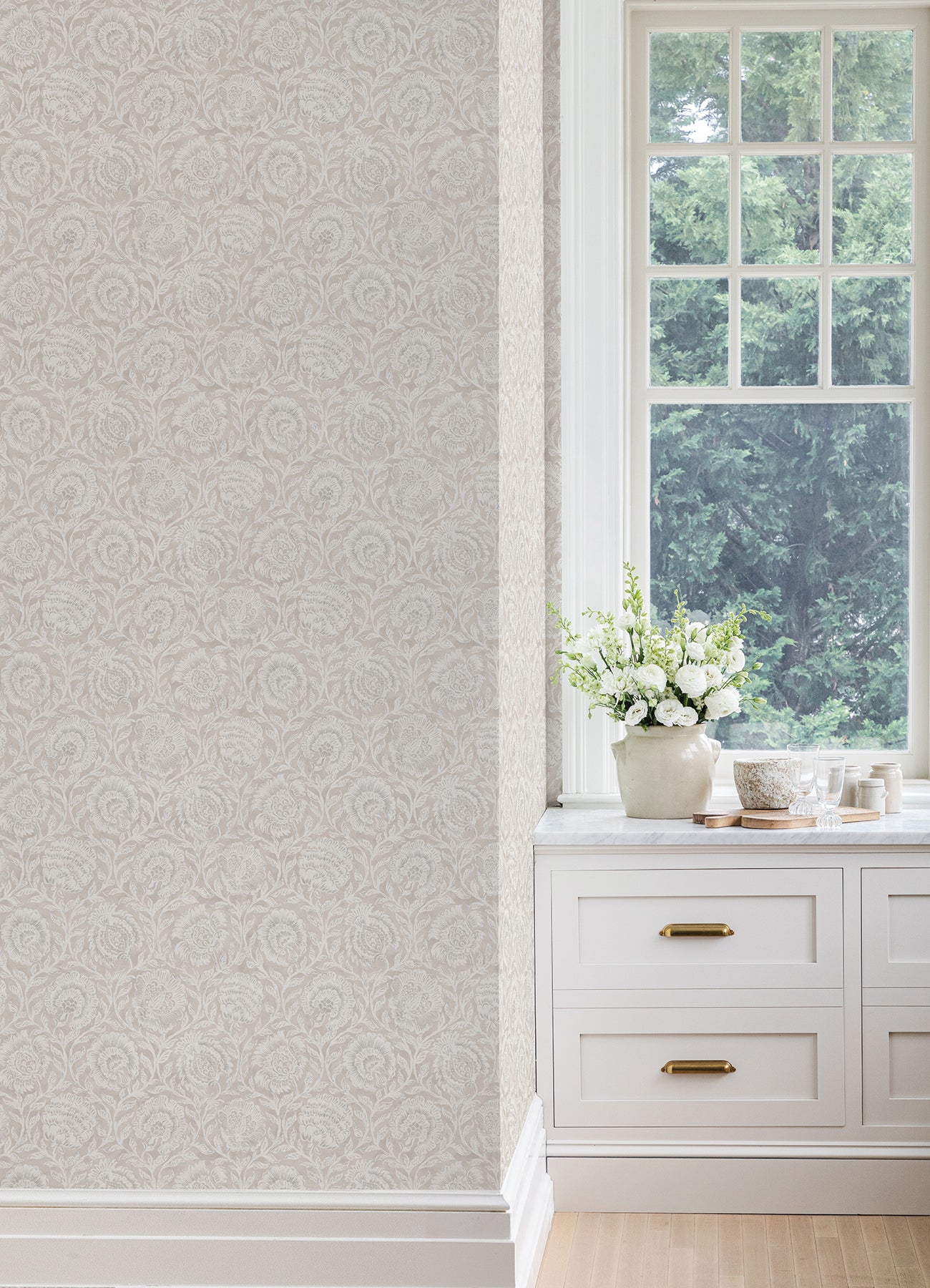 Inspired by heritage prints and handcrafted with care, this soft wheat tan peel and stick wallpaper print from Nabela Noor Home x WallPops brings warmth, grace, and a sense of story to any space. Densely packed blooms and trailing vines in a soft, symmetrical repeat evoke the allure of vintage saris and hand-carved detail. Aliviya Wheat Peel and Stick Wallpaper comes on one roll that measures 20.5 inches wide by 18 feet long.