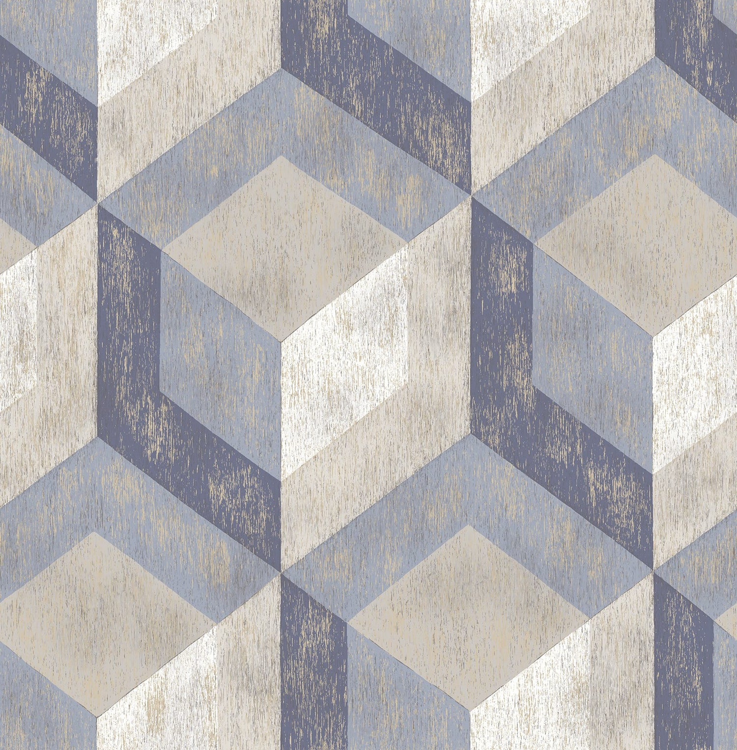 This wallpaper features large-scale tile shapes with a printed marble texture. The hexagonal arrangement is modern and looks custom designed. In neutral hues of federal blue, navy, beige and cream, with metallic gold highlights.