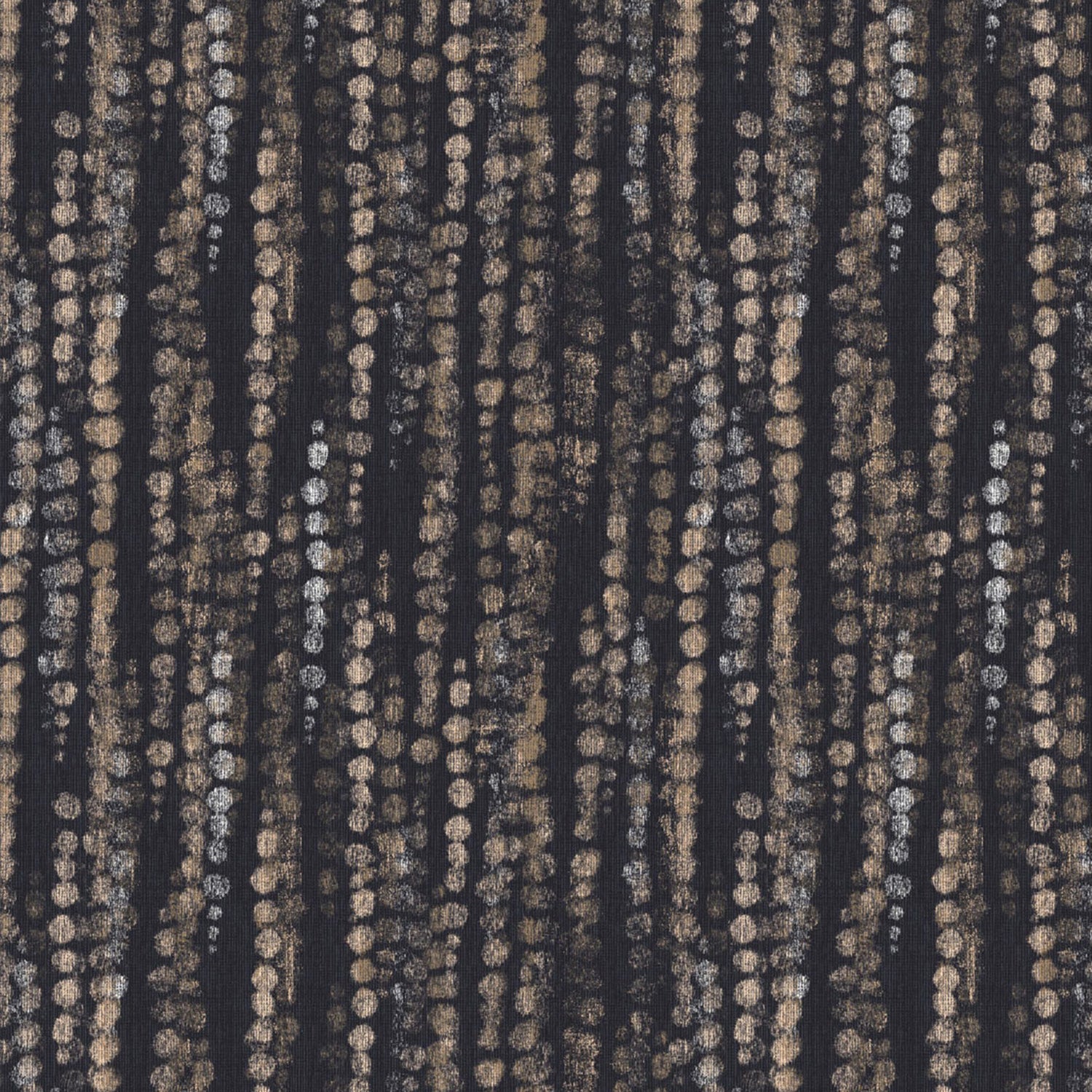Metallic beaded rain design wallpaper with a navy blue ground and metallic copper and coral accents.