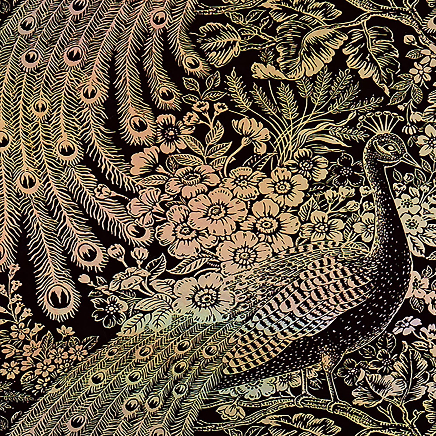 This wallpaper features a whimsical floral and peacock design in a metallic champagne and black background.