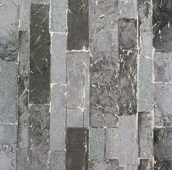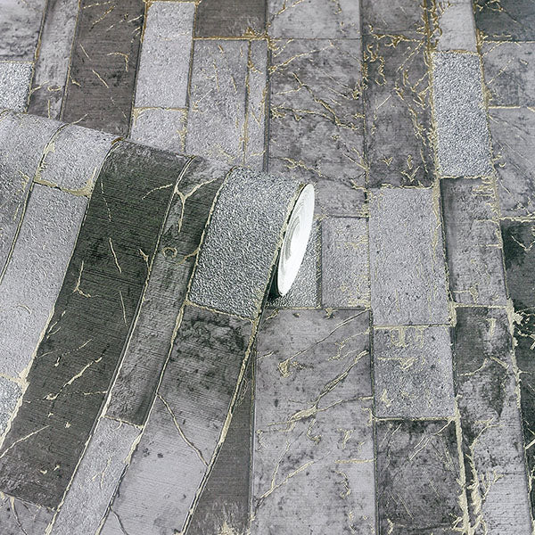 The fissures within and seams between these laid stones are filled with metallic bindings. The stones features black and smokey grey hues with pale gold metallic mortar. Kintsugi is an unpasted, heavyweight vinyl non woven backed wallpaper measuring 20.9 inches wide by 33 feet long, covering approximately 57.5 square feet per roll.