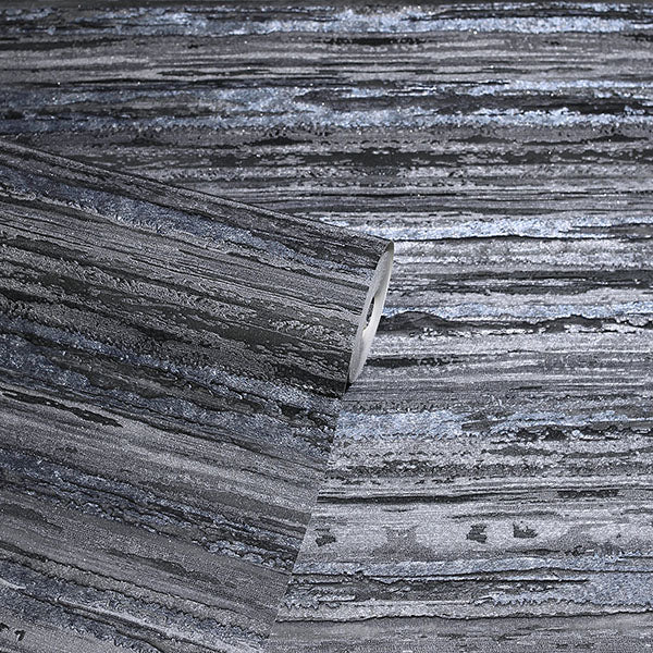 This striated wallpaper offers modern sophistication with both texture and shimmering glitter. Seen here in steel blue and grey. Philomena is an unpasted, heavyweight vinyl paper backed wallpaper measuring 20.9 inches wide by 33 feet long, covering approximately 57.5 square feet per roll.