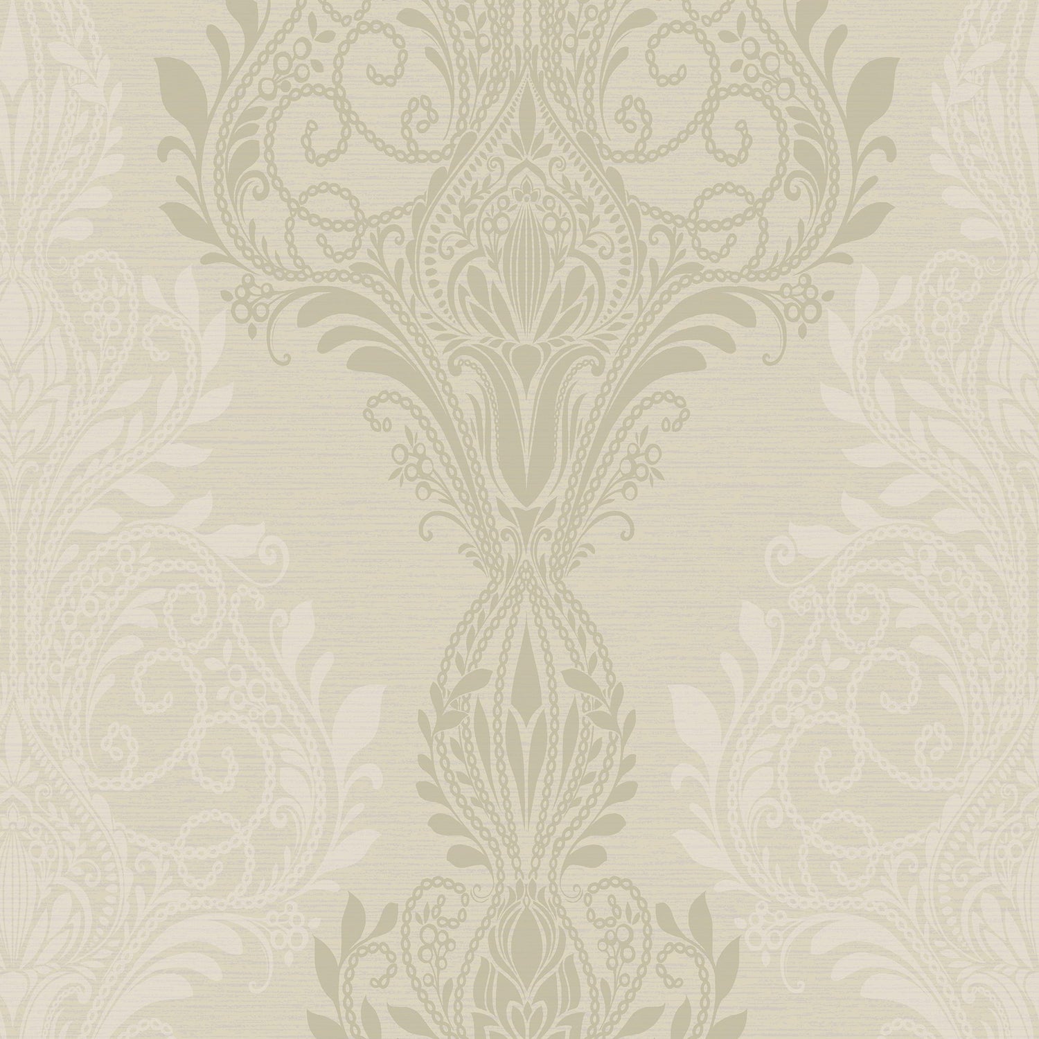 A stunning beaded damask wallpaper with gold metallic, shimmering elegance for your walls. Light taupe coloration.