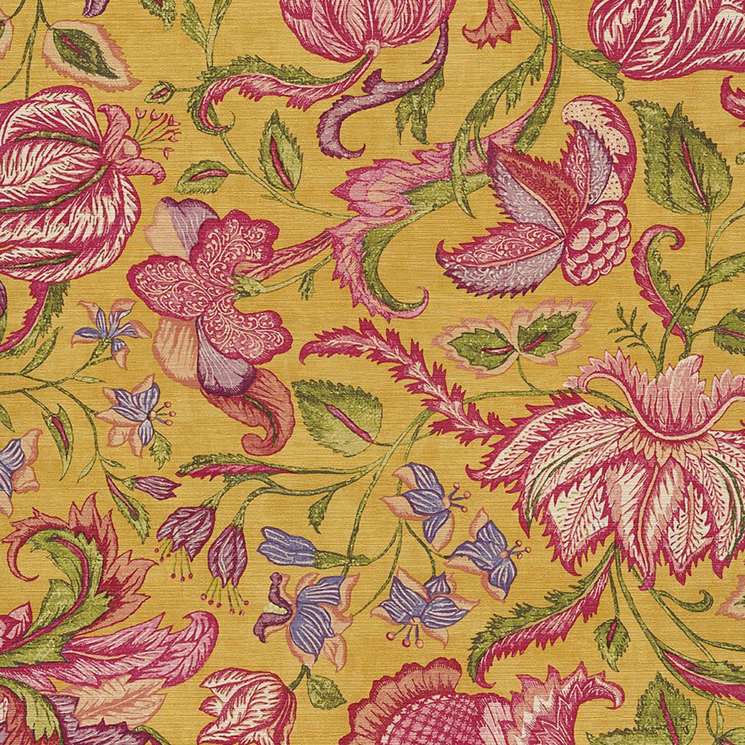 Explore the ryhmic and exotic jacobean floral on vinyl wallpaper. This pattern color features a gold background with pinks, purples and greens jacobean floral.