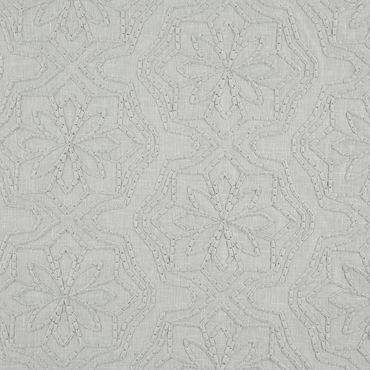 Flecks of silver metallic yarns creating the look of sparkling gems on this embroidered floral pattern fabric. In a soft powder blue coloration.