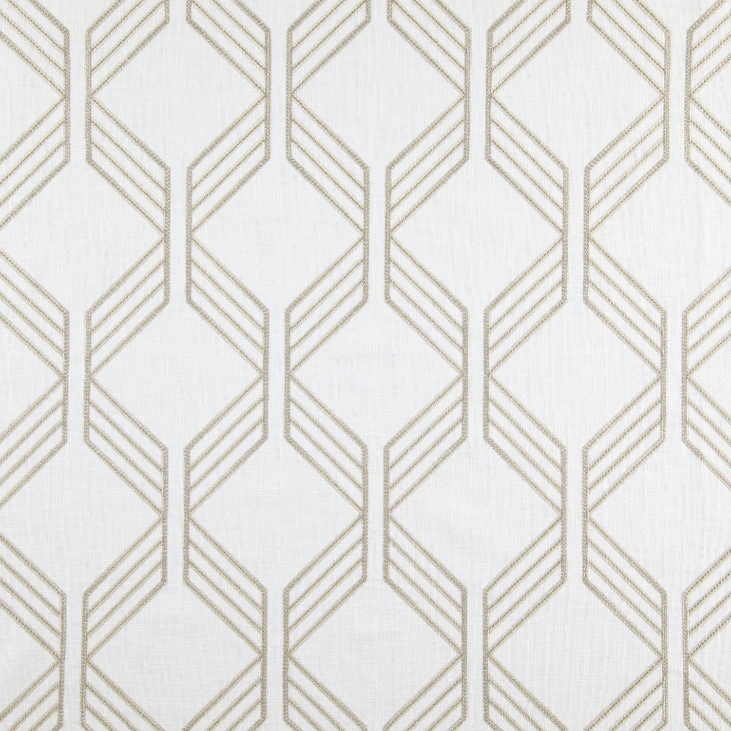 Dramatic large scale geo pattern embroidered on a faux linen basecloth. Sage green on an ivory ground.