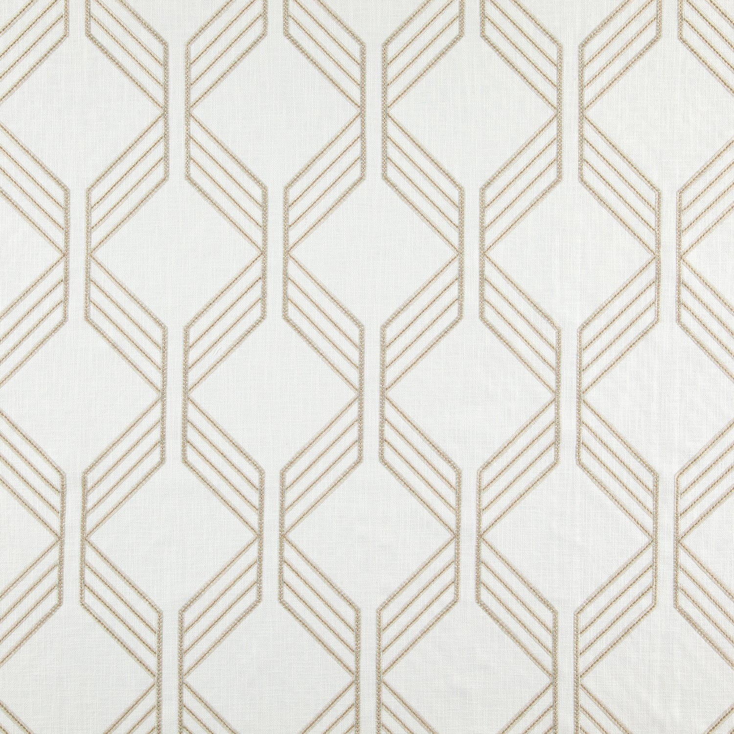 Dramatic large scale geo pattern embroidered on a faux linen basecloth. sage green on a cream ground.