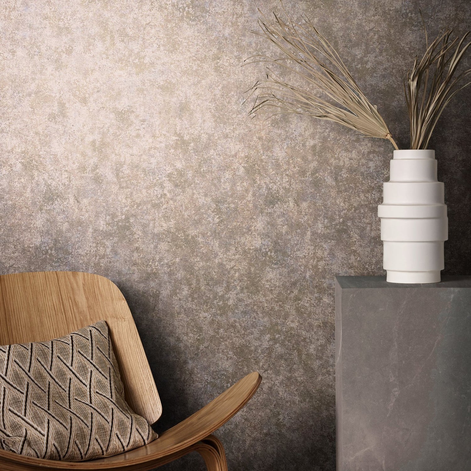 This earthy wallpaper will be a warming welcome to your home and perfect on all four walls or accompanied by a complementing design. The wallpaper has a subtle emboss that creates some structural depth and comes in a mottled grey, brown and pink colour that is reminiscent of parched clay soil. It’s a great way to bring your room up to date with a natural and earthy feel.