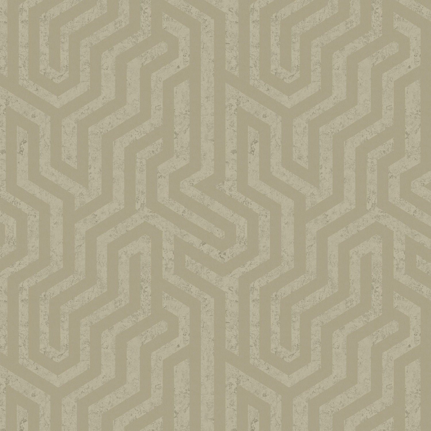 Textured, geometric design in a warm silver shimmer, on a green, beige, stone-like background.