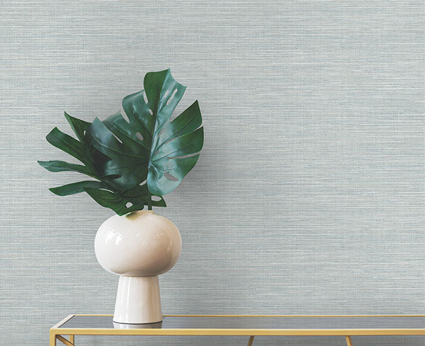Every element of this grasscloth mimicry is immaculate, from the stitched detailing to its subtle tactility. Featured here in shades of light blue, aqua, and cream. Winn is an unpasted, non woven wallpaper measuring 27 inches wide by 27 feet long, covering approximately 60.8 square feet per roll.