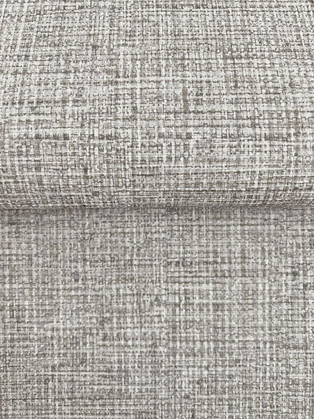 A fine, tightly loomed basketweave gives this faux fabric wallpaper both visual and tactile texture. Seen here in shades of stone grey with hints of olive. Clarkson is an unpasted, non woven wallpaper measuring 27 inches wide by 27 feet long, covering approximately 60.8 square feet per roll.