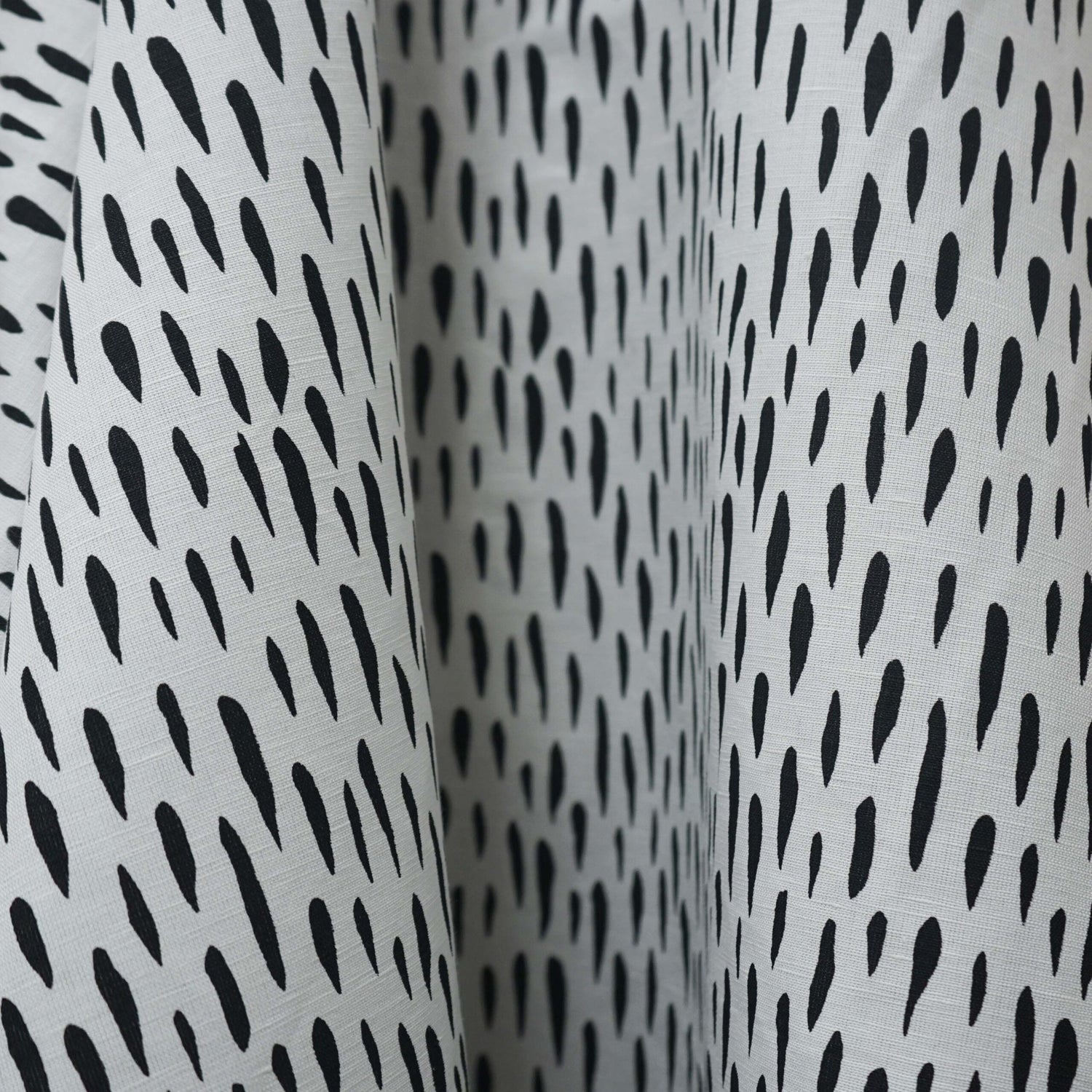 A lively onyx black tear drop printed pattern on a crisp white base cloth.