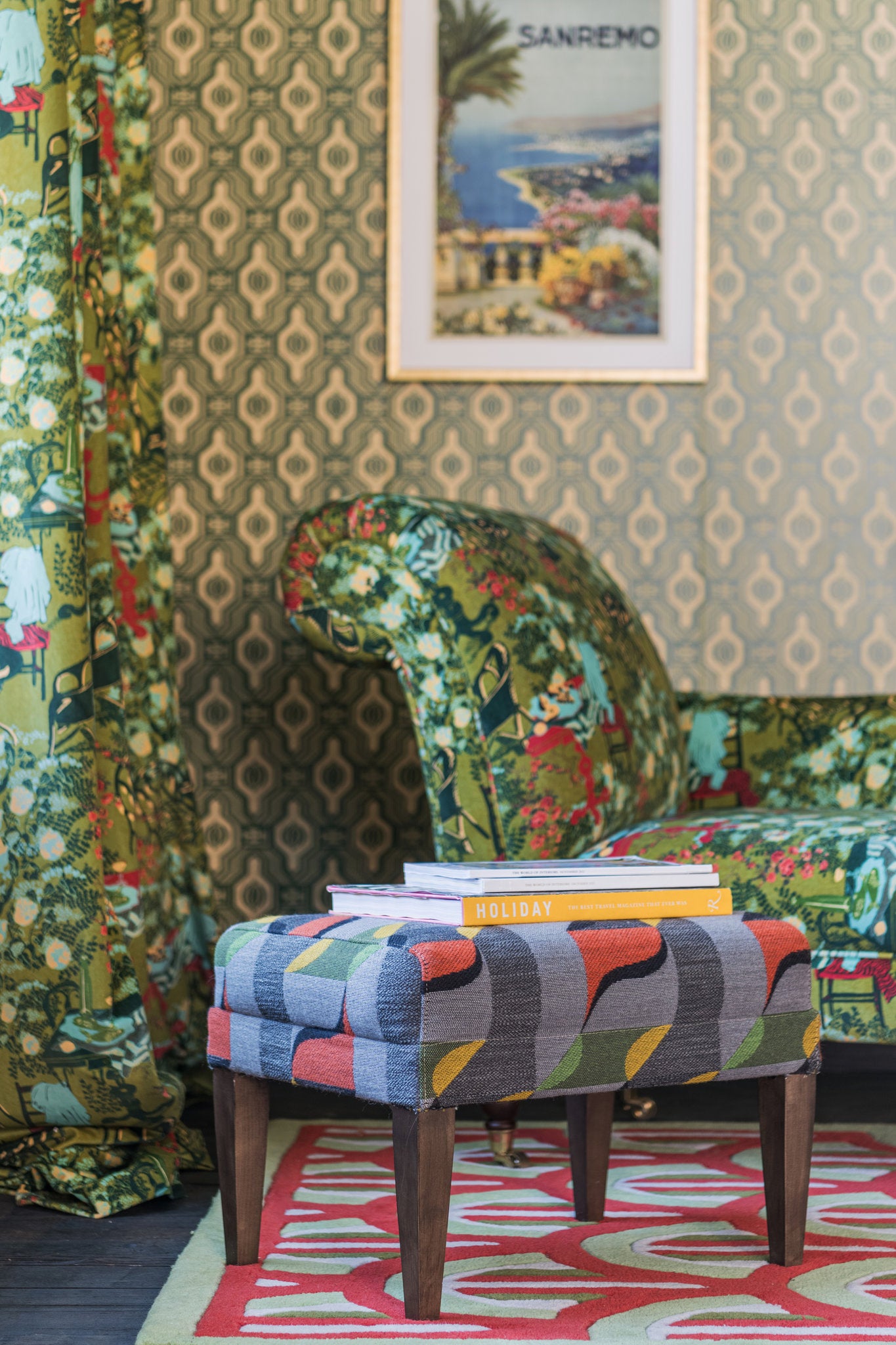 In the whimsical world of DOLCERIA, visual illusions take center stage amidst a delightful array of colors and contrasts. Imagine your space adorned with a fabric that skillfully manipulates perception, as vibrant elements dance against a backdrop of serene gray. Here, shades of green, yellow, and red seamlessly blend together, conjuring the playful illusion of a cube with effortless charm. You can choose the playful DOLCERIA for upholstery and window treatments.