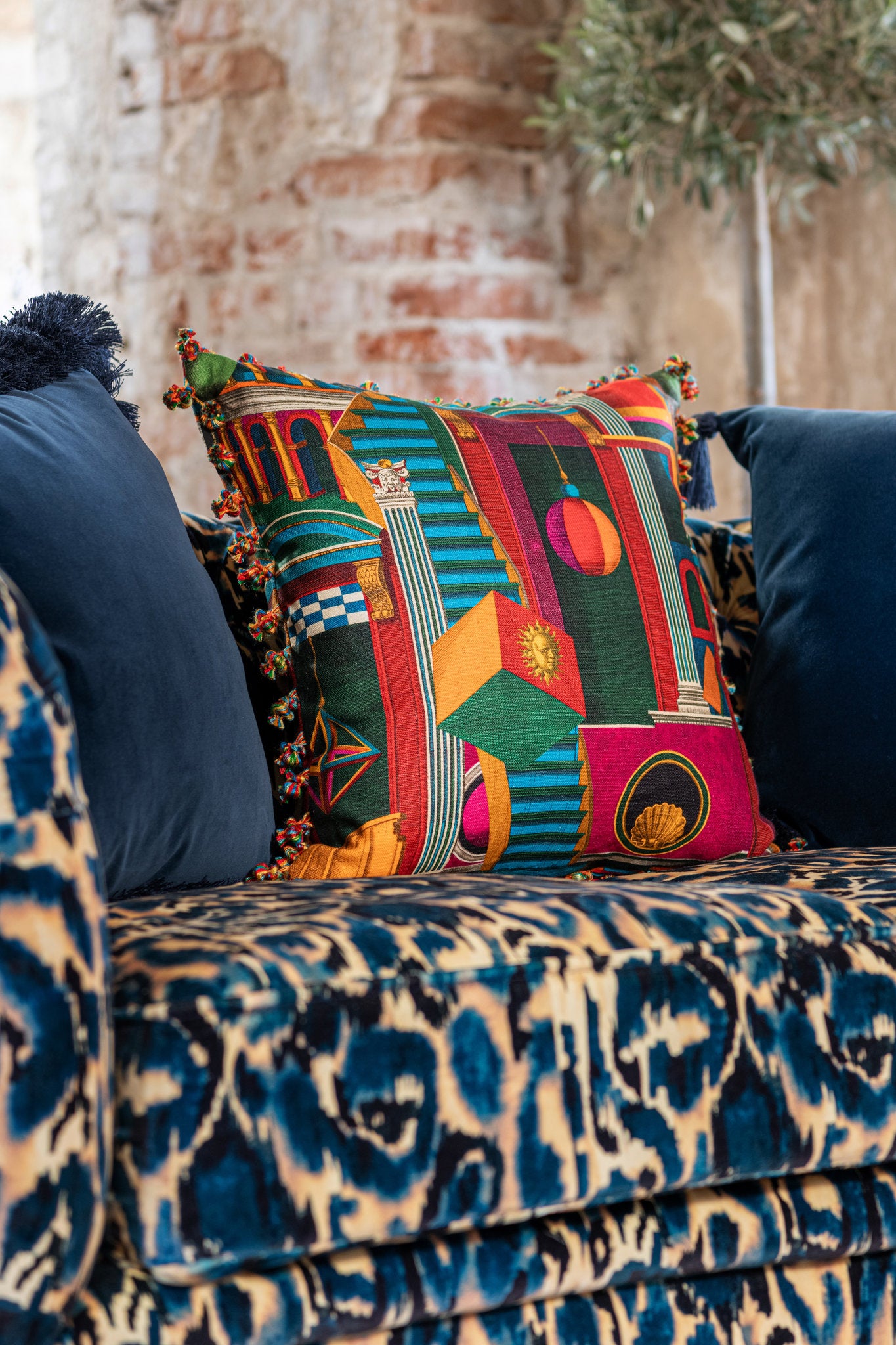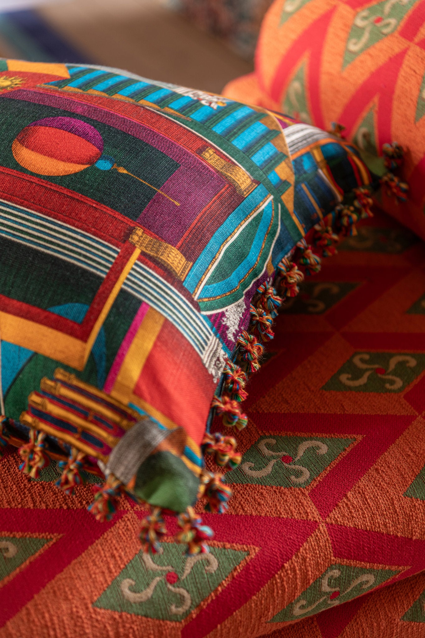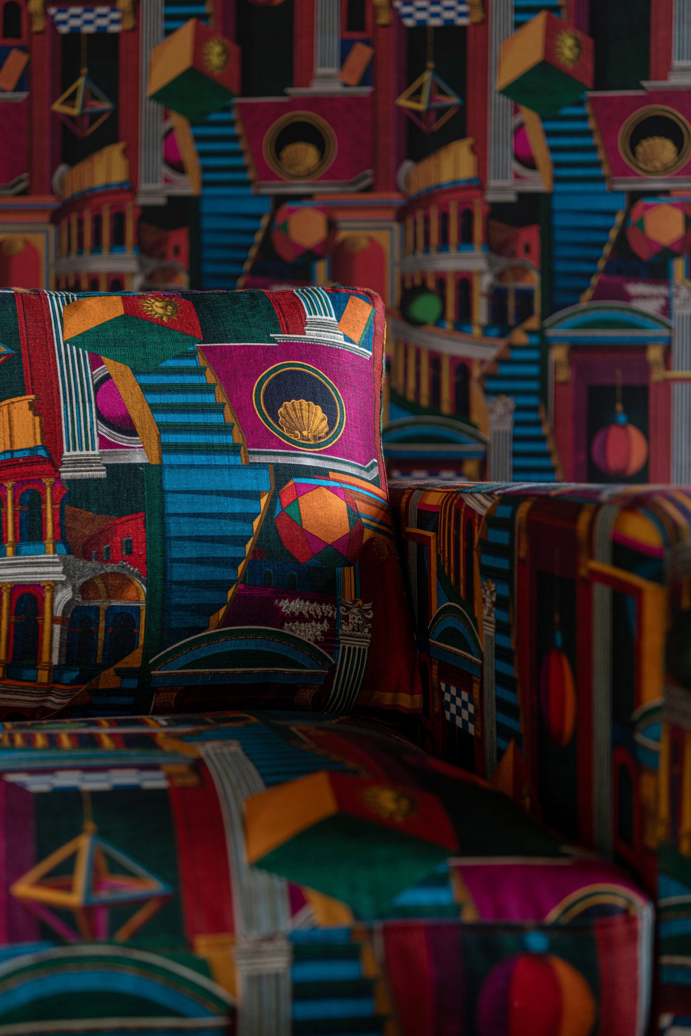 Amidst the labyrinthine alleys and abstract geometrical shapes, each corner of the PIAZZA DEGLI ARLECCHINI natural linen fabric invites you to escape into a realm of vibrant hues and boundless imagination. As you wander deeper into the piazza, you are greeted by a playful dance of colors and shapes — bold splashes of blue, red, green, and orange intertwine with intricate geometrical forms, recreating the bustling energy of the square. Let the lively spirit of the crowded piazza infuse your space with a sense of wonder and creativity. You’ll find that PIAZZA DEGLI ARLECCHINI it’s perfect for curtains, blind, cushions or upholstery.