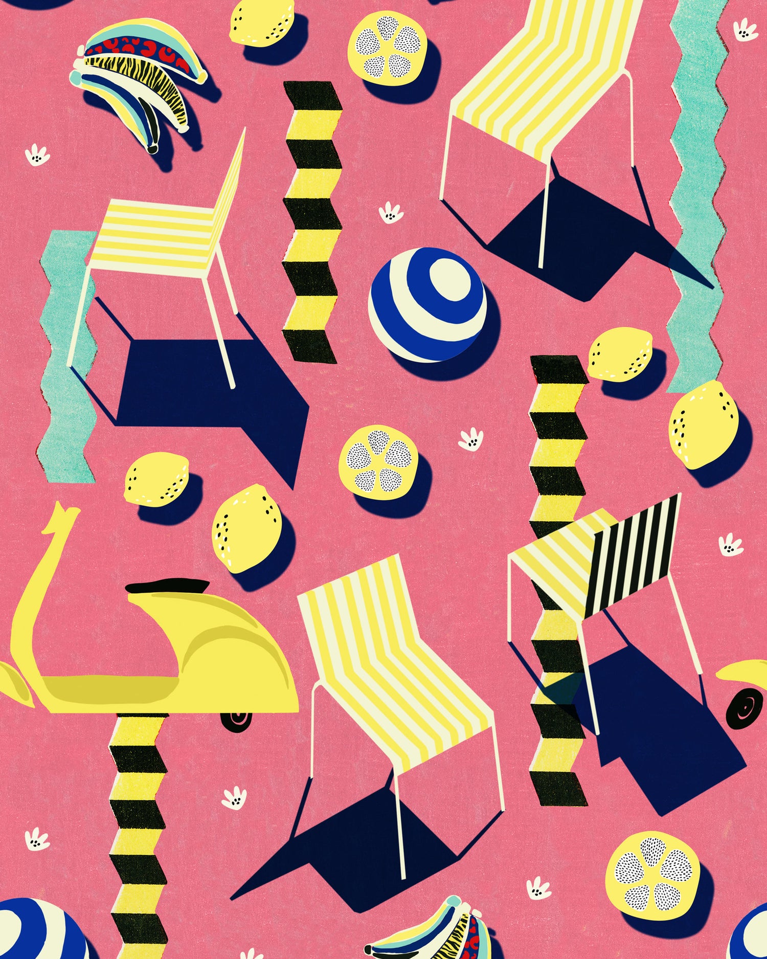 Transform your space into a summer oasis with MOTO BELLO, letting its vibrant hues and playful motifs evoke memories of lazy days spent under the sun. This exuberant tapestry of design captures the essence of leisure and delight, where beach chairs beckon invitingly, lemons add a zesty pop of color, and the iconic Vespa guaranties a touch off retro chic. Abstract elements dance across the surface, infusing the design with a sense of movement and dynamism that is both captivating and exhilarating. Available in both verdant green and playful pink backgrounds, MOTO BELLO offers a choice between lush tranquility and energetic whimsy, allowing you to tailor your space and unravel your playful spirit.
