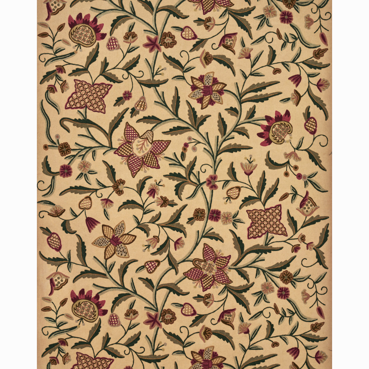 Somerset Crewel is a large-scale leafy floral stitched on a soft cotton ground. Featuring scrolling stylized blossoms rendered in a variety of crewel techniques, this loose, lively, pattern-rich fabric works beautifully for furniture, pillows or window treatments.