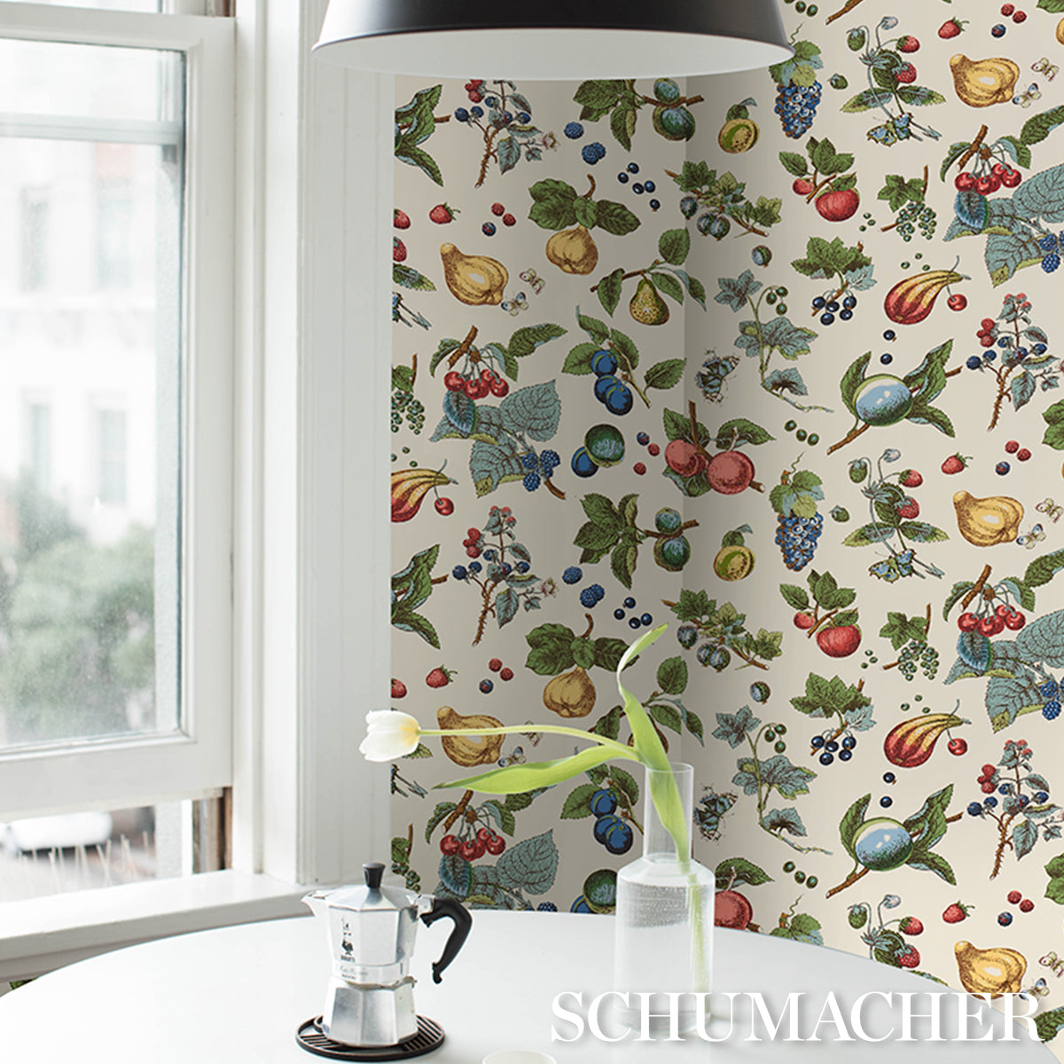 We were delighted to discover Berry Grove in the Schumacher archive and couldnt wait to revive this cheery botanical print. A stylized allover pattern with delicate linework and details, this medium-scale wallpaper offers an abundance of charm and retro flairperfect for a kitchen or breakfast room. Also available as a fabric.