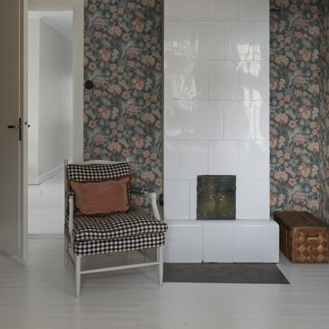 The sweet scents and sights of a spring day come to life in slate-colored Jane Mural, a wallpaper by Boråstapeter featuring beautiful blooms and fancy foliage. Named for the wife of British textile designer William Morris, this print imbues interiors with vintage charm. This product is FSC Certified. Available in North America exclusively through Schumacher.