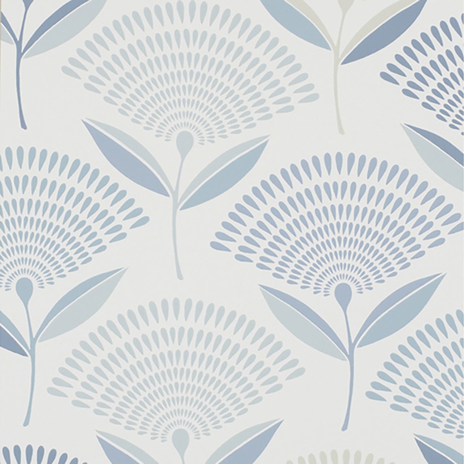 Large contemporary style floral wallpaper in hues of blue, from an ice to an aqua to a dresden and alabaster coloration on an ivory background.