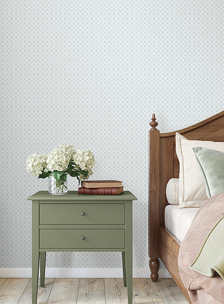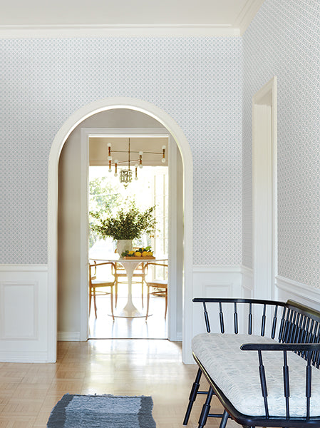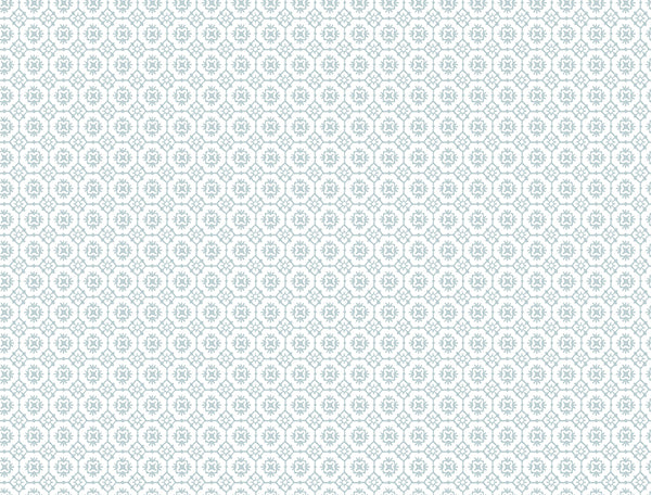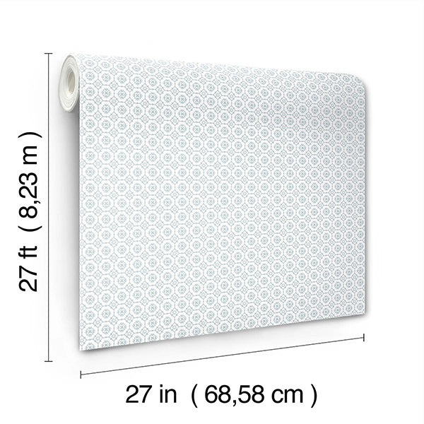 Pattern Priti features an intricate grid of florals composed of larger blooms embellished with petite blossoms at each corner. Seen here in sky blue against white. Priti is an unpasted, non woven wallpaper measuring 27 inches wide by 27 feet long, covering approximately 60.8 square feet per roll.