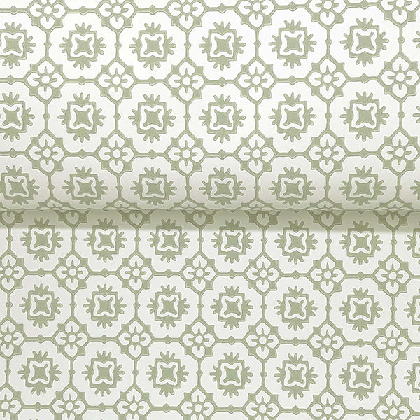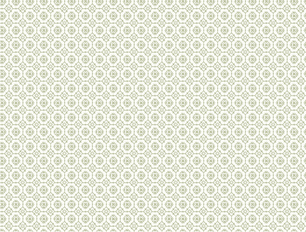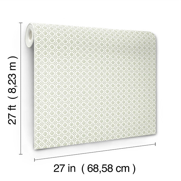 Pattern Priti features an intricate grid of florals composed of larger blooms embellished with petite blossoms at each corner. Seen here in sage green against white. Priti is an unpasted, non woven wallpaper measuring 27 inches wide by 27 feet long, covering approximately 60.8 square feet per roll.