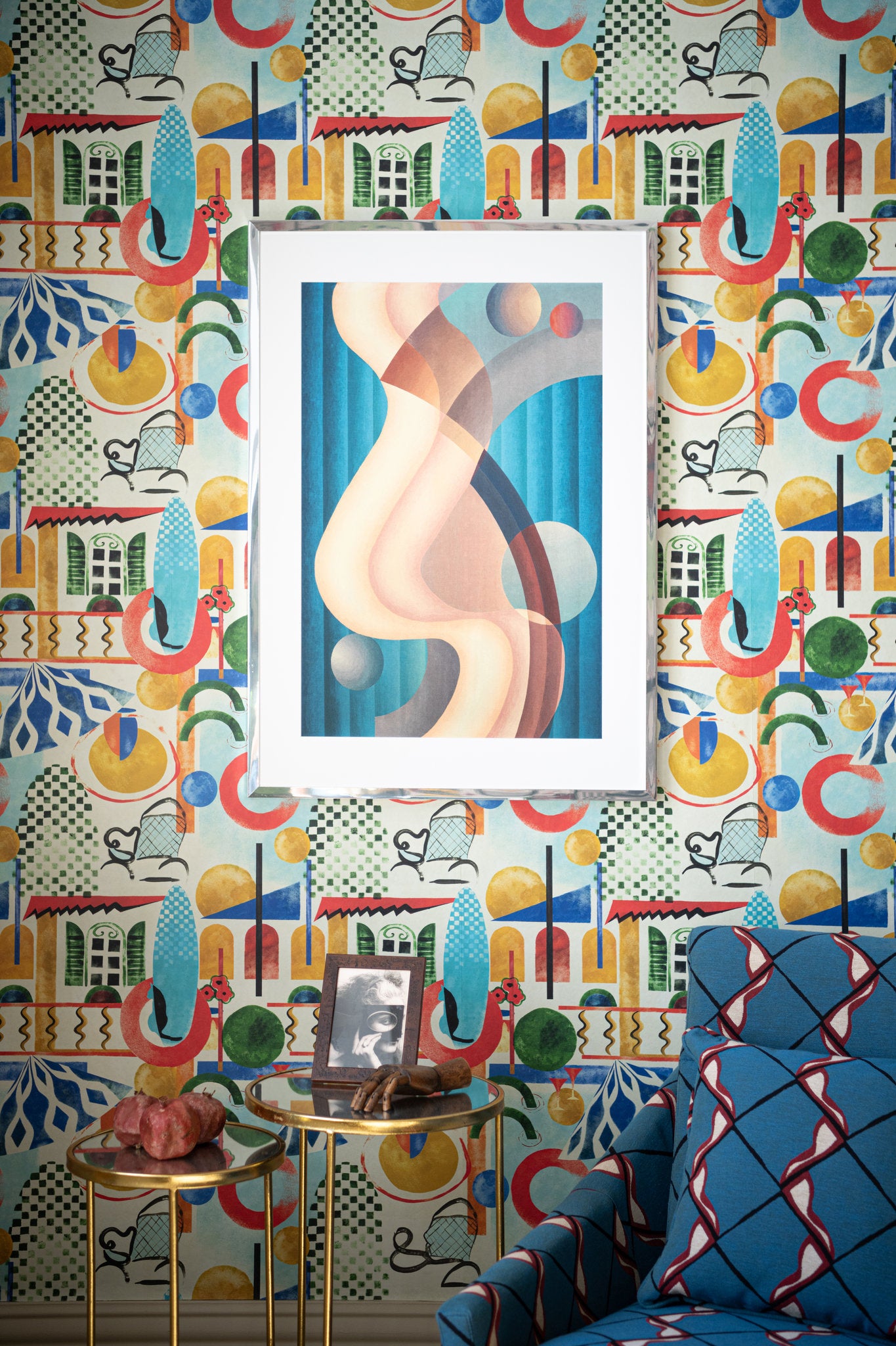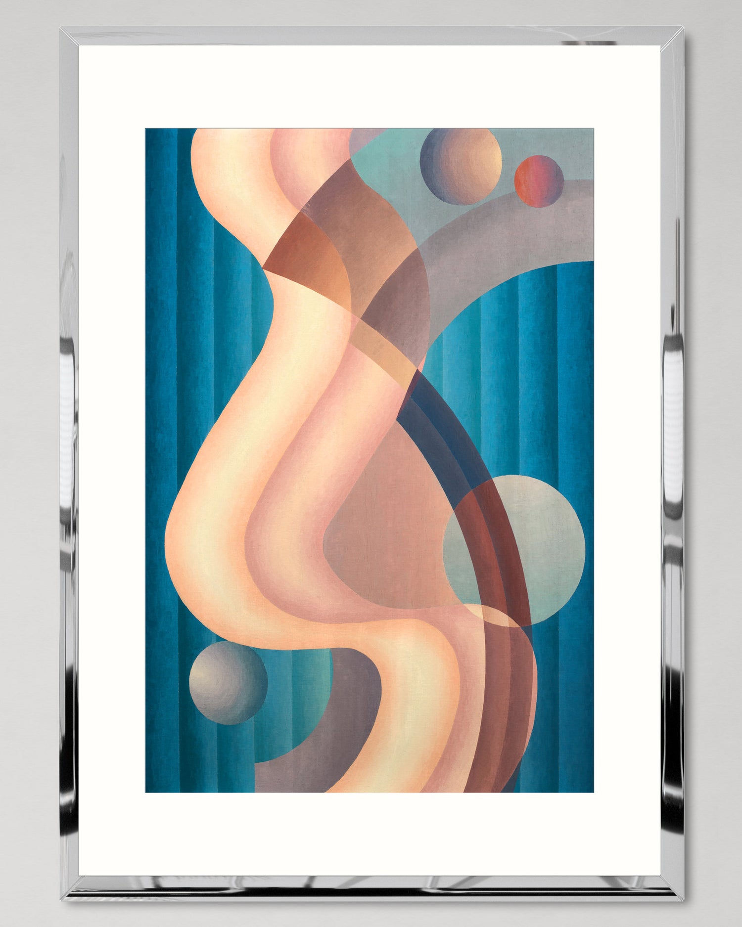 Depicting Stuart Walker’s famous painting, this artwork transports you to the abstract art movements of the early 20th century. This captivating artwork beautifully blends flowing shapes with a harmonious colour palette, evoking a sense of vintage charm and artistic expression. Printed on fine art paper and elegantly framed in a mirror silver frame, this piece is sure to make a striking statement on any wall. Complete with mount board, float glass, and metallic hangers, it's ready to hang and transform your space with its captivating allure