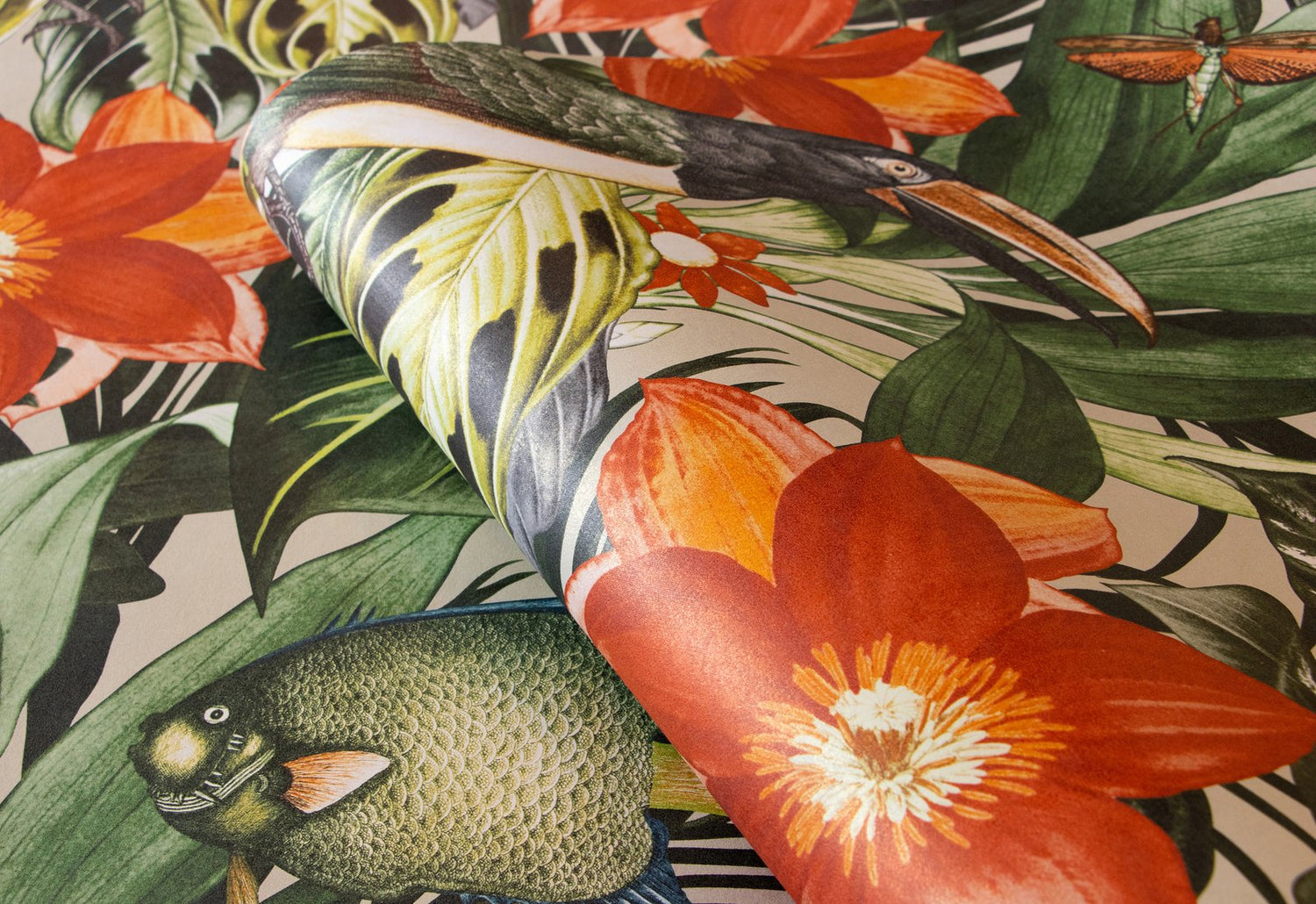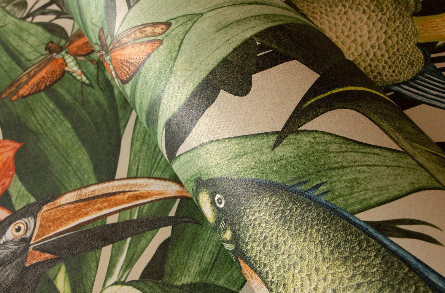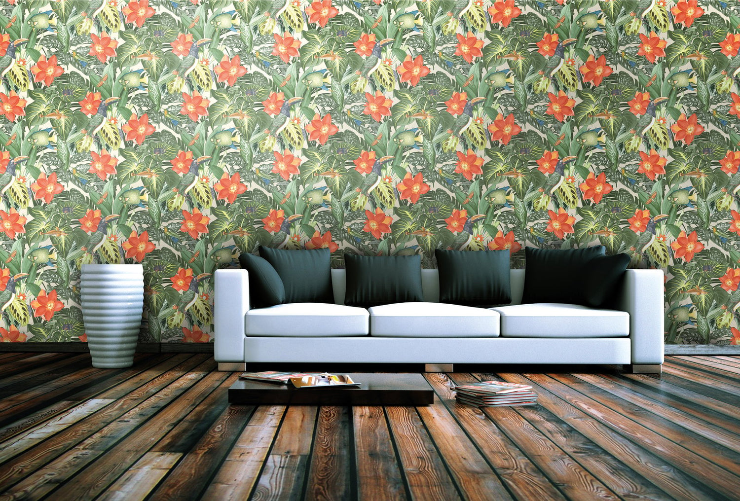 The joke is in the details. Where at MO'OREA small birds hide in the jungle thicket, at PALAU toucans stretch their powerful bills upwards. Dragonflies buzz around, even fish populate the foliage. Quite bizarre and cinematic. PALAU plays with the dream of the exotic. In addition, there is the rhythm created by the arrangement of the strong flowers and large birds. You could almost think that tropical nature is dancing. The healthy living non-woven wallpaper looks cheerful, lively and can be used in a variety of ways. In the living room, in the dining room or as a dream excursion in the bedroom. Children also like this motif with flowers and animals. So why not wallpaper in the children’s room? PALAU brings a breath of fresh air! The dream of the exotic The TROPICAL collection, which also includes PALAU, is inspired by the world of the tropics. With six colors, the design offers a nice selection that actually makes clear differences due to the strong contrast and rhythm. PALAU harmonizes perfectly with restrained plain wallpapers, for example with TUVALU from the same collection.