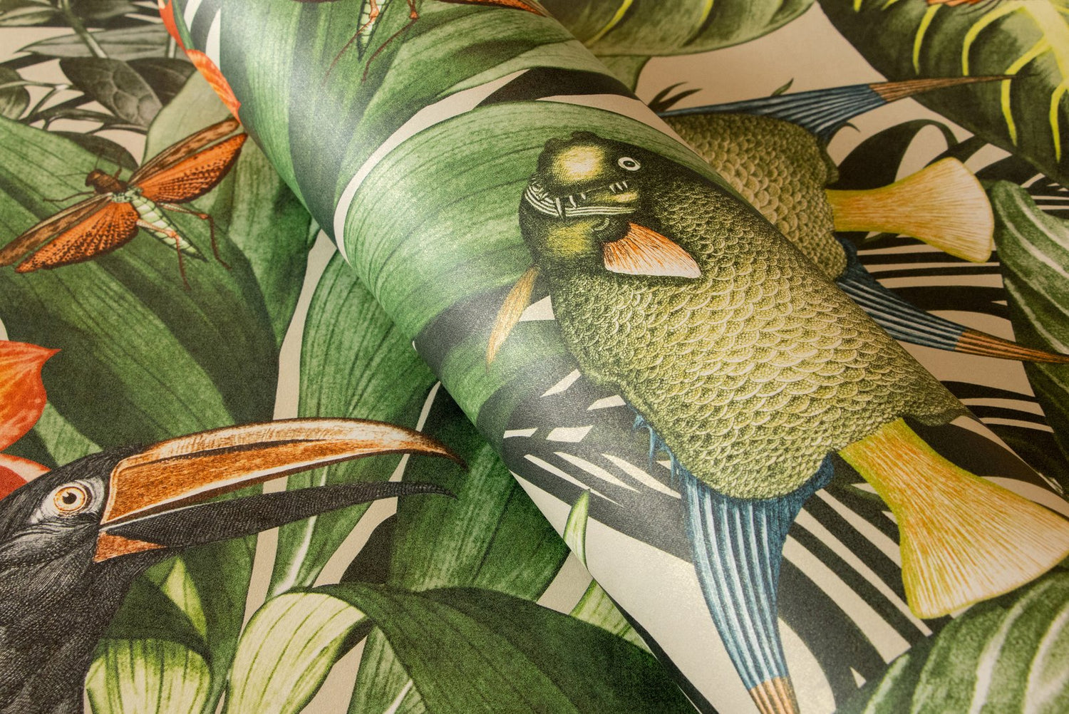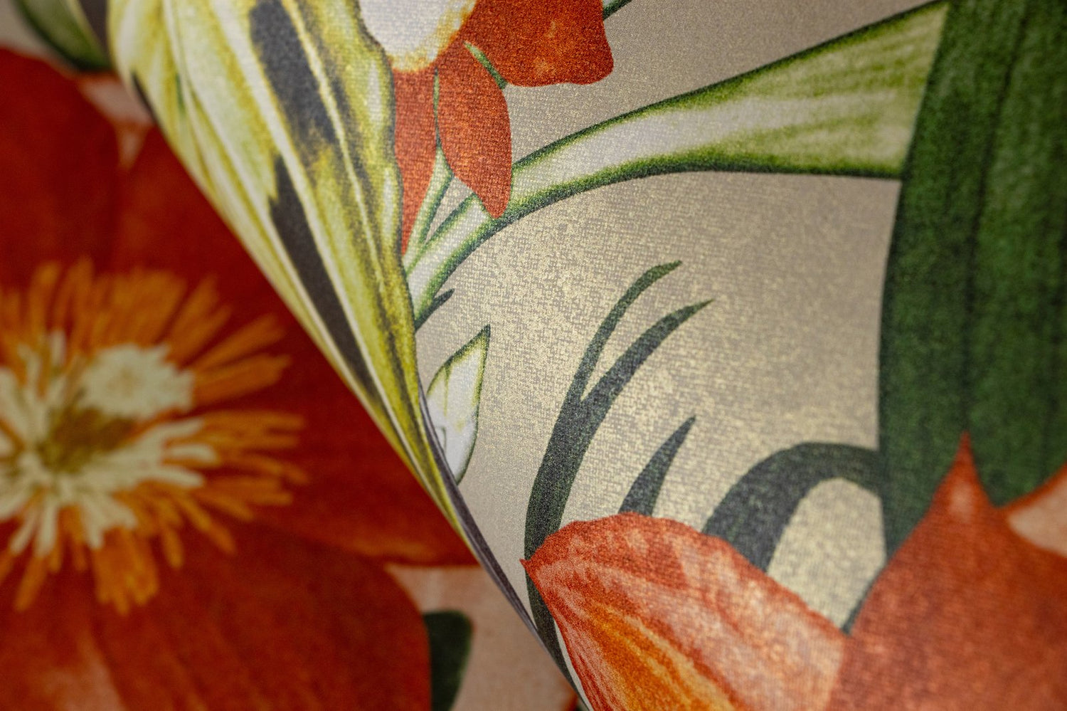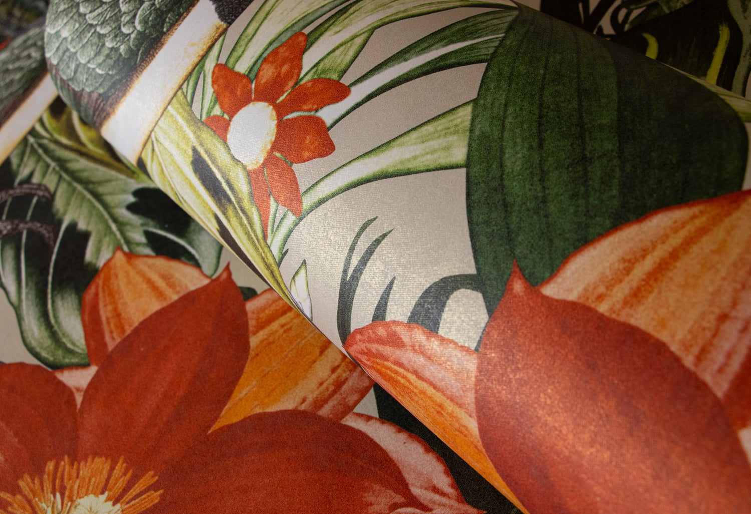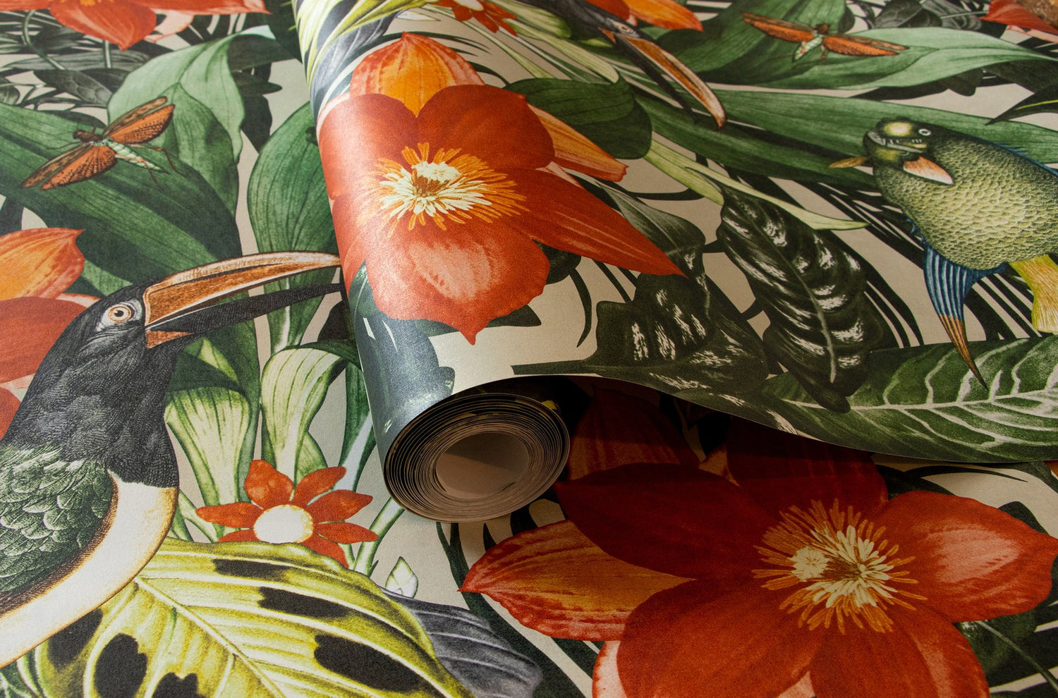 The joke is in the details. Where at MO'OREA small birds hide in the jungle thicket, at PALAU toucans stretch their powerful bills upwards. Dragonflies buzz around, even fish populate the foliage. Quite bizarre and cinematic. PALAU plays with the dream of the exotic. In addition, there is the rhythm created by the arrangement of the strong flowers and large birds. You could almost think that tropical nature is dancing. The healthy living non-woven wallpaper looks cheerful, lively and can be used in a variety of ways. In the living room, in the dining room or as a dream excursion in the bedroom. Children also like this motif with flowers and animals. So why not wallpaper in the children’s room? PALAU brings a breath of fresh air! The dream of the exotic The TROPICAL collection, which also includes PALAU, is inspired by the world of the tropics. With six colors, the design offers a nice selection that actually makes clear differences due to the strong contrast and rhythm. PALAU harmonizes perfectly with restrained plain wallpapers, for example with TUVALU from the same collection.