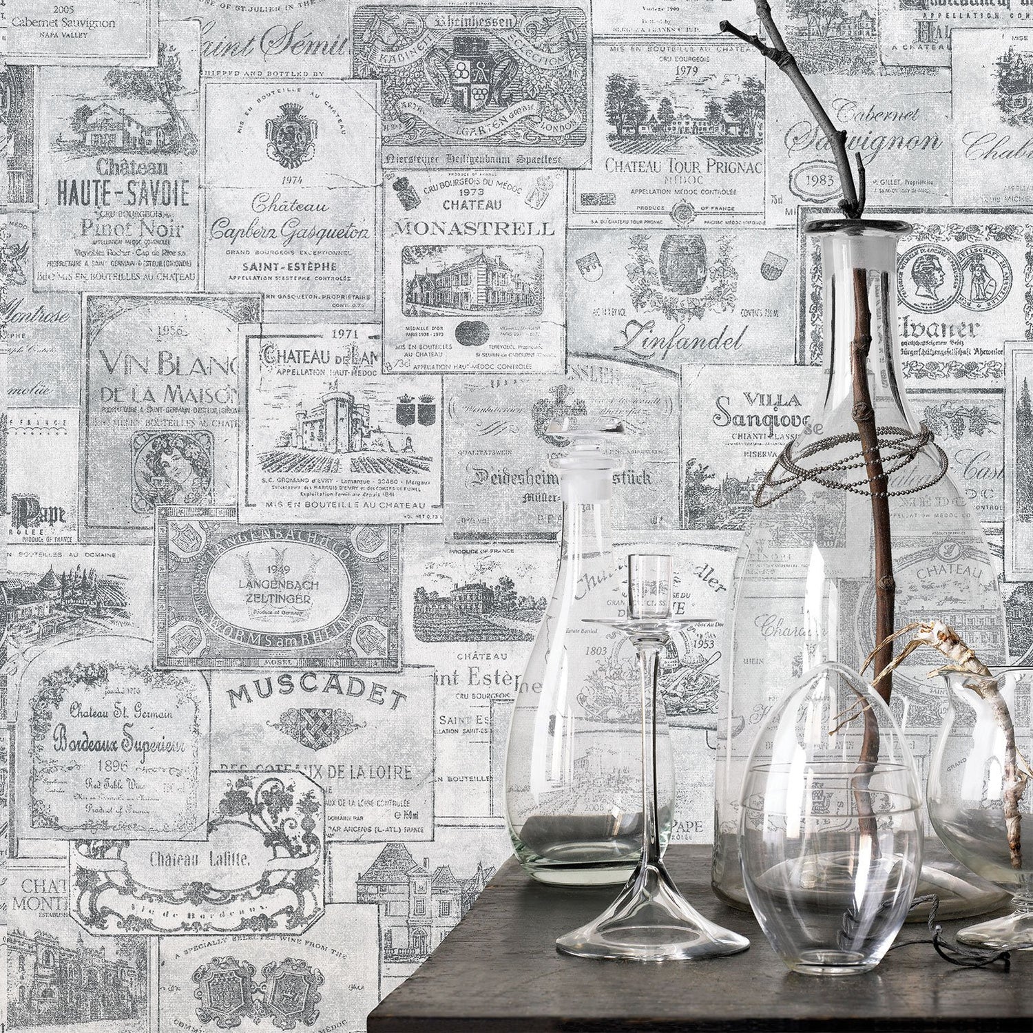 Galerie G56175 Wine Labels Silver Grey Wallpaper