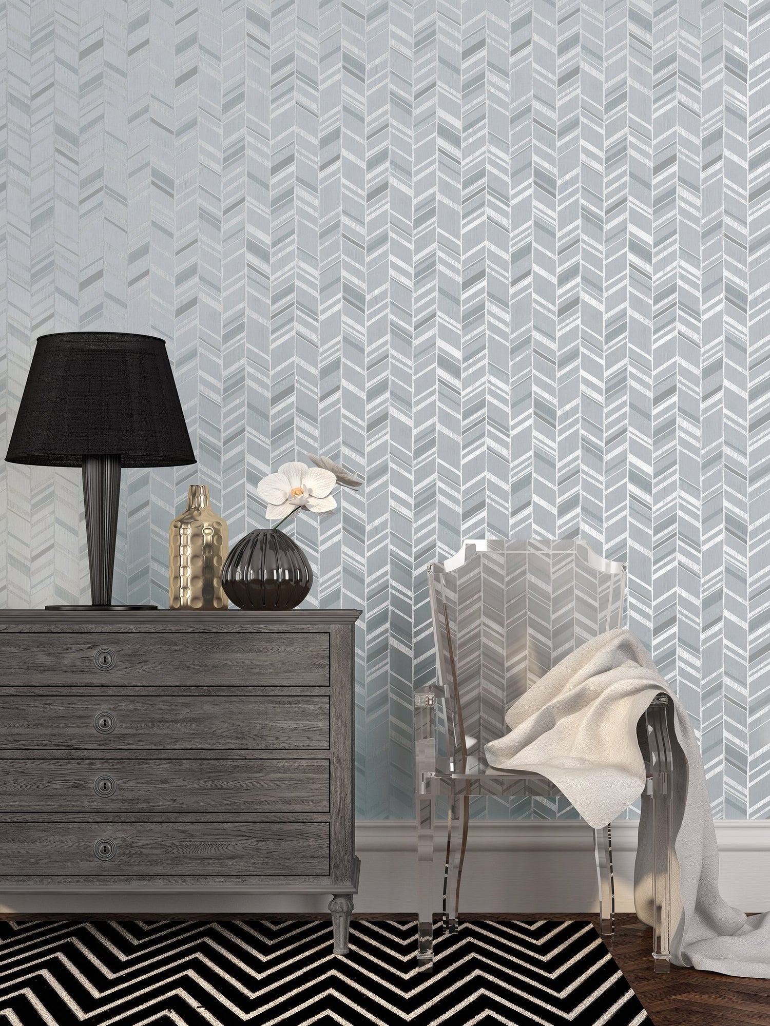A fantastic, bold and fun design incorporating uneven vertical chevrons separated by relaxed, vertical metallic bans. A strong metallic glitter finish punctuates some of the chevron lines, in between which there are a matte black texture for contrast. A pattern with a youthful, masculine element to it, perfect for a teenage bedroom or a bachelor pad!