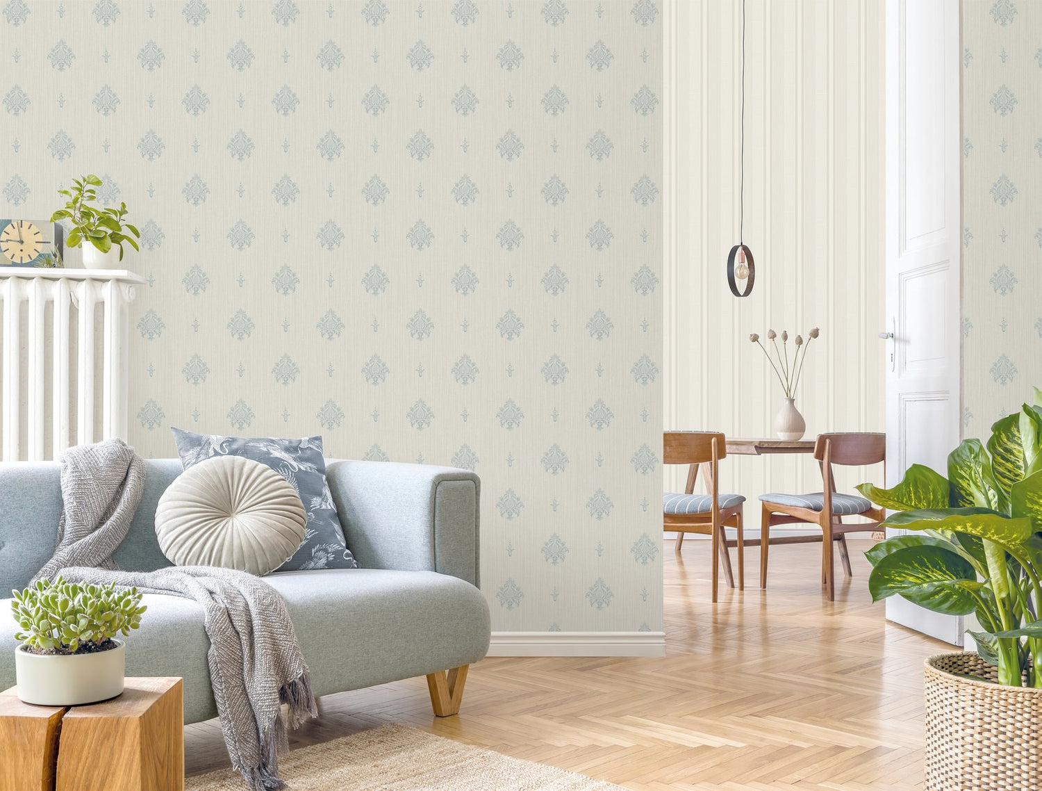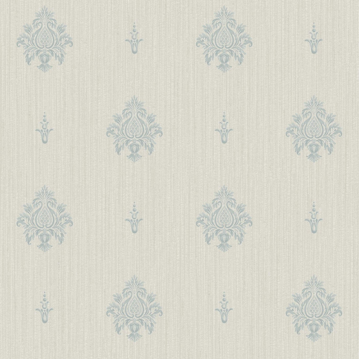 A very delicate, small damask motif is spread out on a background of a realistic vertical linen style weave, creating the luxurious effect of embroidered silk.