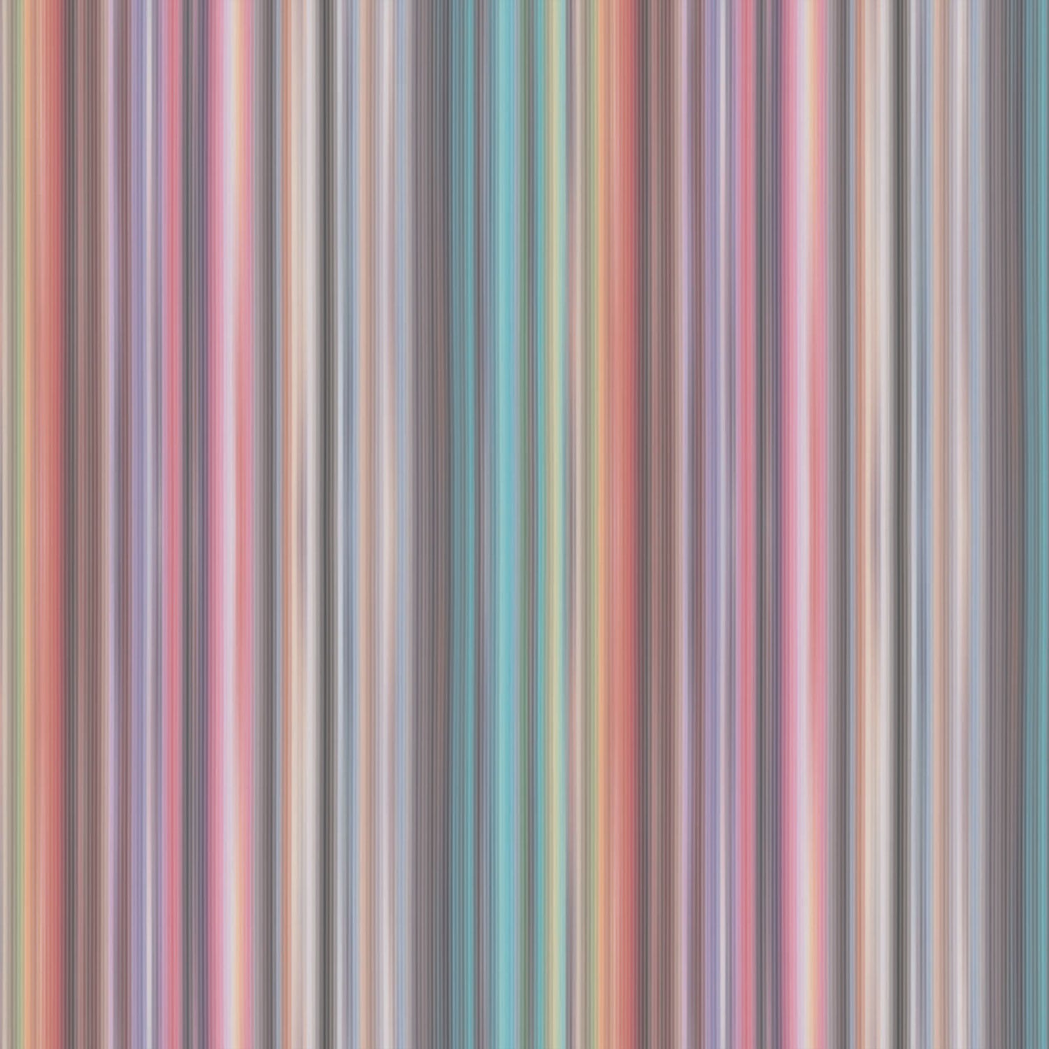 A Missoni Home rainbow colored striped wallpaper with shimmering multi hues of red, purple, blue, green,yellow and orange.