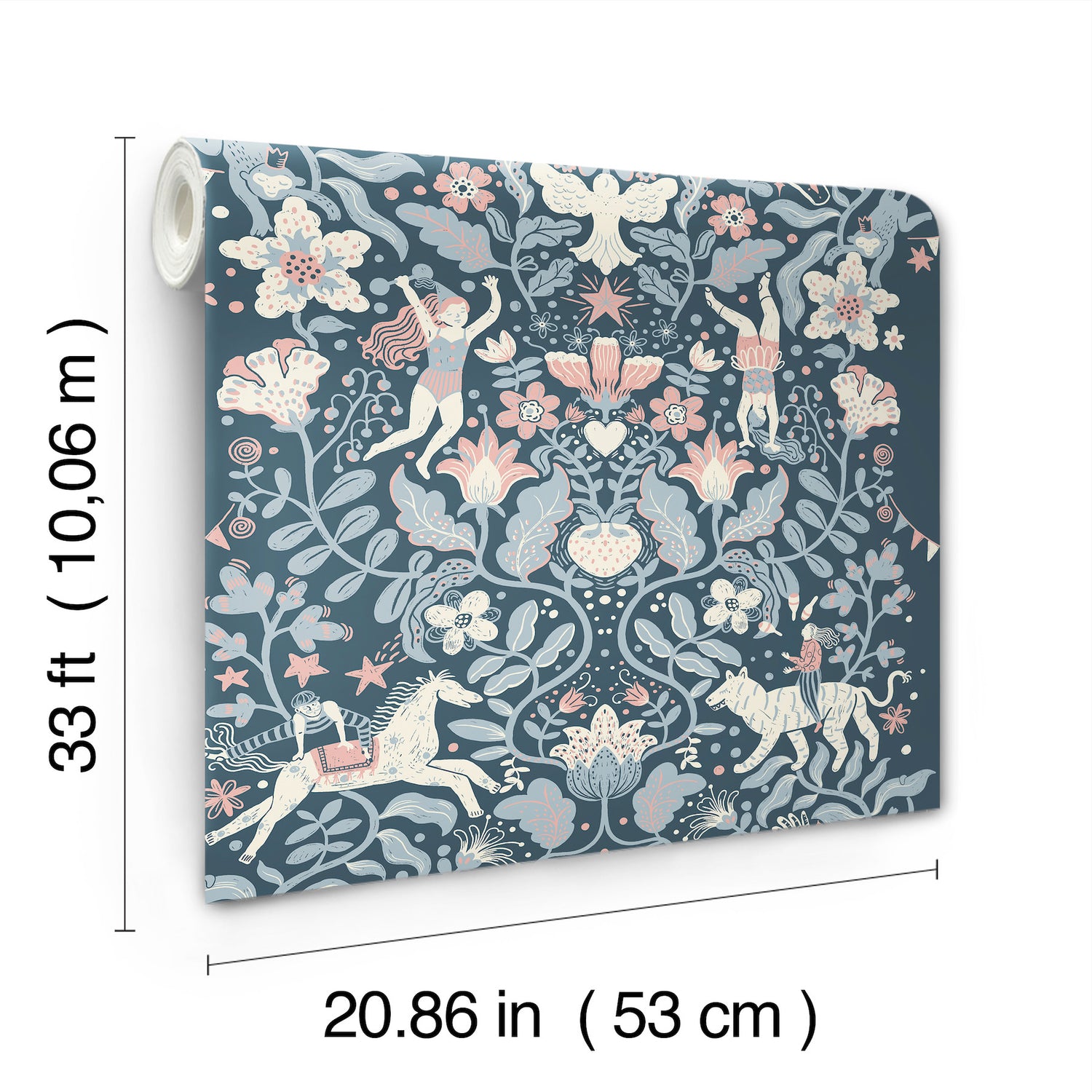This illustrative stripe revels in the marvels of the circus. Acrobats, jugglers, and other joyful performers and their animal companions make an appearance throughout the twining floral vines. Pictured here in a palette of navy, light blue, pink, and white. This Cirkus Wallpaper measures approximately 20.9 inches wide by 33 feet long, measuring approximately 57.5 square feet per roll. Embark on a journey bursting with child-like wonder with Lina Schnaufer's collection, Daydream. The trip around the world features explorations on hot air balloons, train rides through the mountains, trips to the circus, and other whimsical adventures.