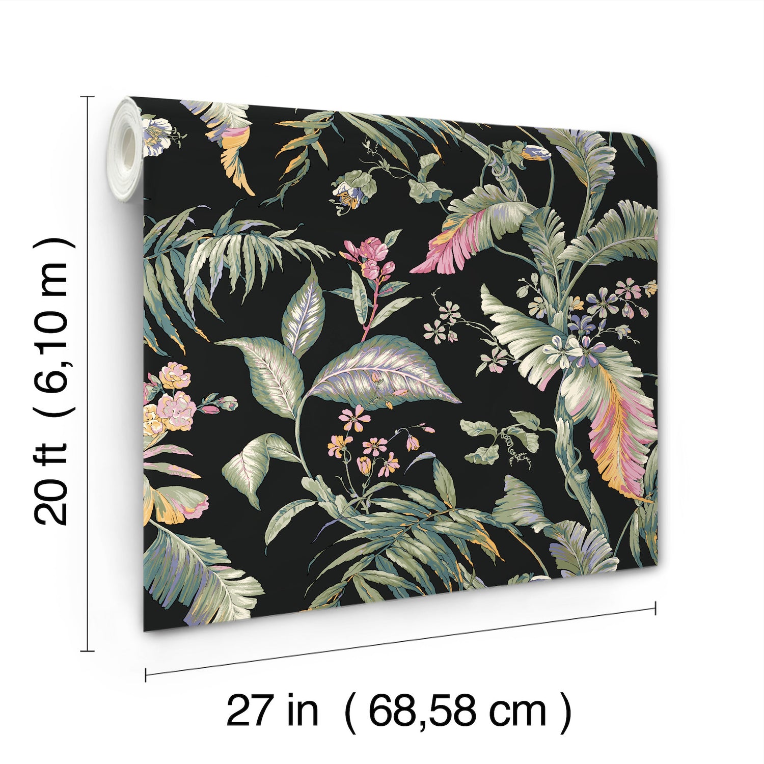Pattern Fiji Garden’s swaying tropical leaves and flowers offer a little slice of paradise for everyday living, the lush green foliage touched with hints of pink, blue and yellow and richly offset against black. This Fiji Garden Peel and Stick Wallpaper measures approximately 27 inches wide by 20 feet long, measuring approximately 45 square feet per roll. Heritage botanical beauty is inspired by forests, fields, and gardens in bloom.